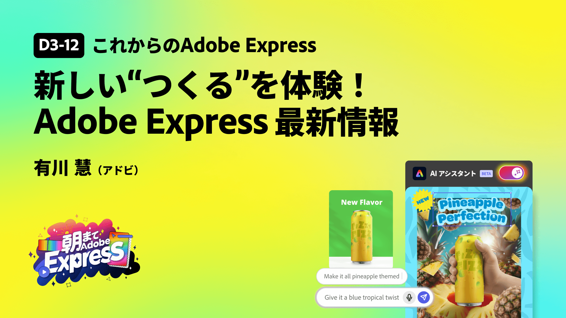 | D3-12 | これからのAdobe Express ― 最新リリースで広がる"つくる"楽しみ | 有川 慧(アドビ) |