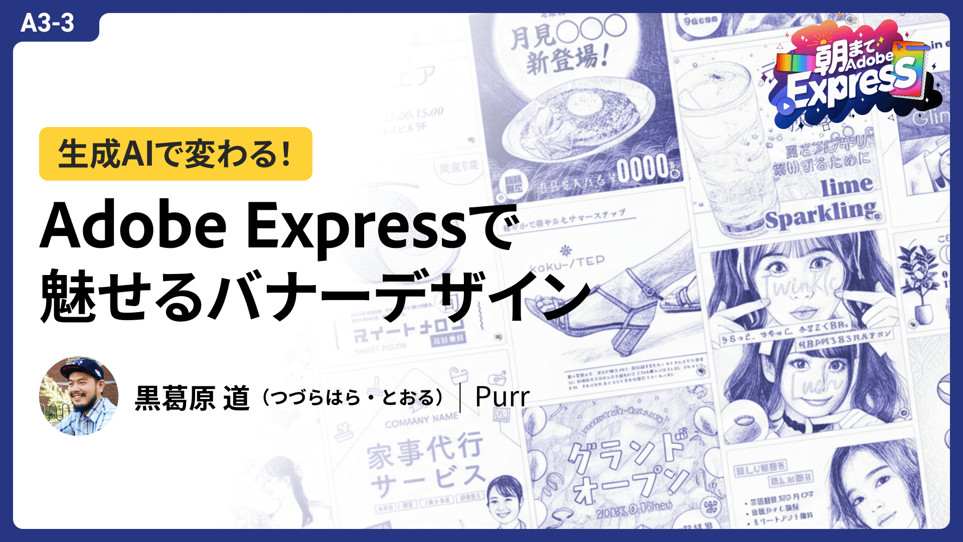 | A3-3 | 生成AIで変わる!Adobe Expressで魅せるバナーデザイン | 黒葛原 道(Purr) | ||