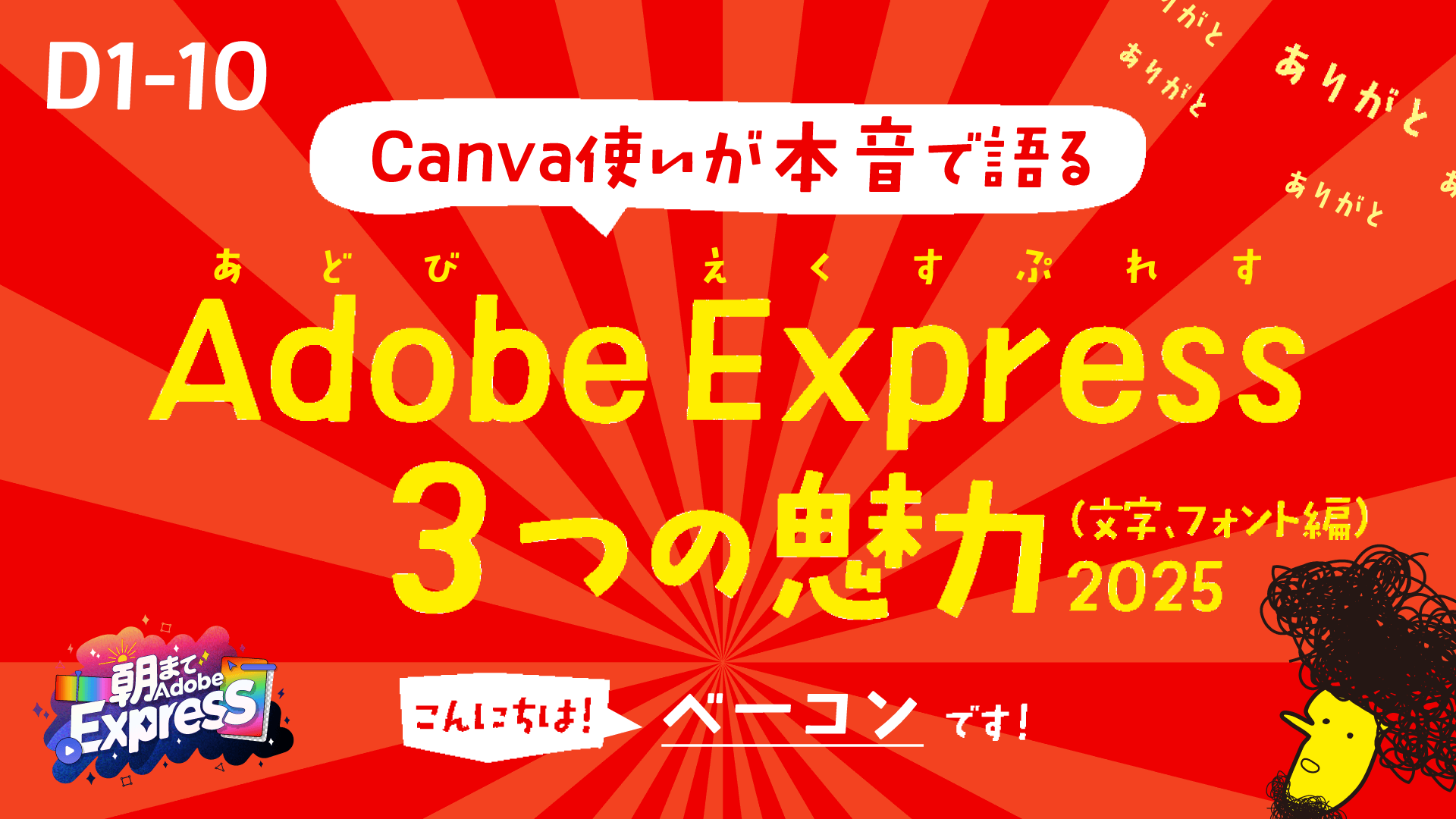 | D | 16:00-17:00 | D1-10 | Canva使いが本音で語る Adobe Expressの3つの魅力2025(文字、フォント編) | ベーコン |