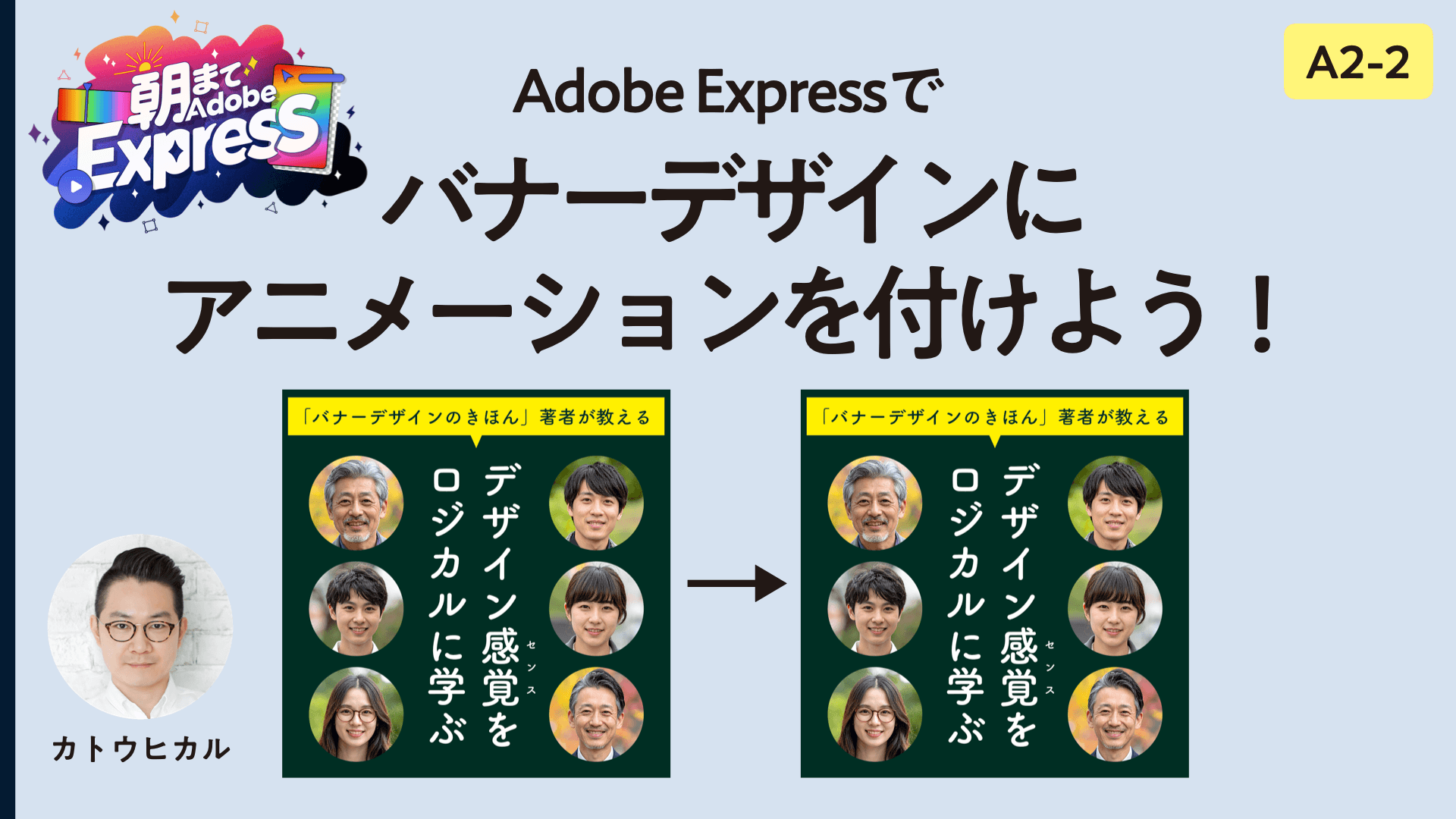 | A2-2 | Adobe Expressでバナーデザインにアニメーションを付けよう! | カトウヒカル | ||