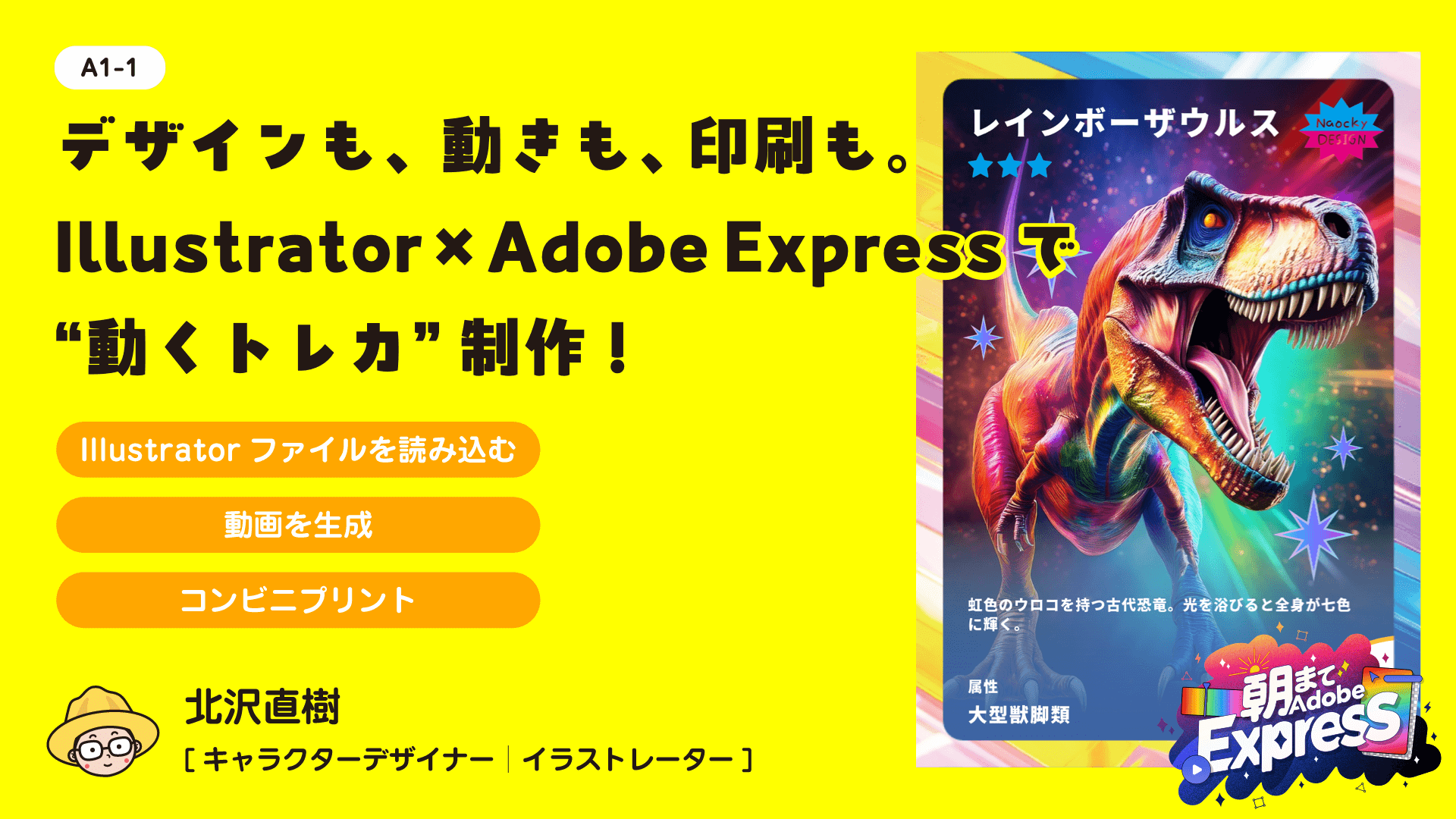 | A | 13:00-14:00 | A1-1 | デザインも、動きも、印刷も。Illustrator×Adobe Expressで“動くトレカ”制作! | 北沢 直樹 |