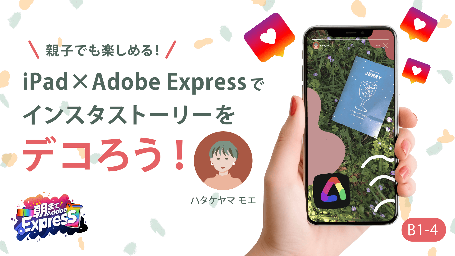 | B | 14:00-15:00 | B1-4 | 親子でも楽しめる!iPad✖️Adobe Expressでインスタストーリーをデコろう! | ハタケヤマ モエ |