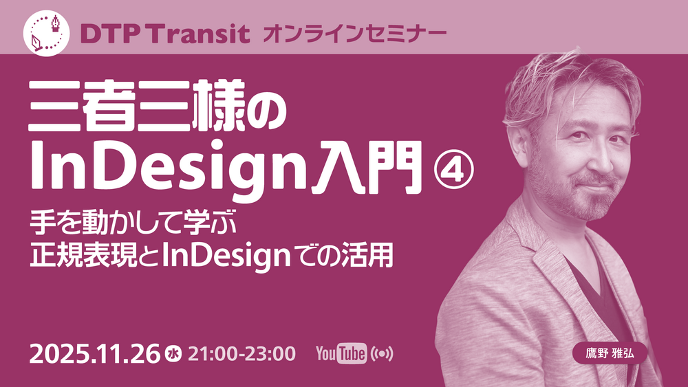 InDesign入門シリーズの第4弾。正規表現の基礎とInDesignでの活用について、演習スタイルで解説します。