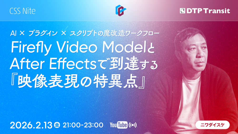 本セミナーでは、DTP Transitのコアなファン層である「ツールへの探究心が強いクリエイター」に向け、Fireflyで生成した素材を、サードパーティ製プラグインで徹底的に加工・合成し、スクリプトで制御するという、極めてハイエンドかつマニアックなワークフローを公開します。「アドビ公式の安心感」と「外部プラグインの破壊力」を融合させ、短時間で圧倒的な映像美を作り出す“Motion Design Studio流”の秘伝を伝授します。