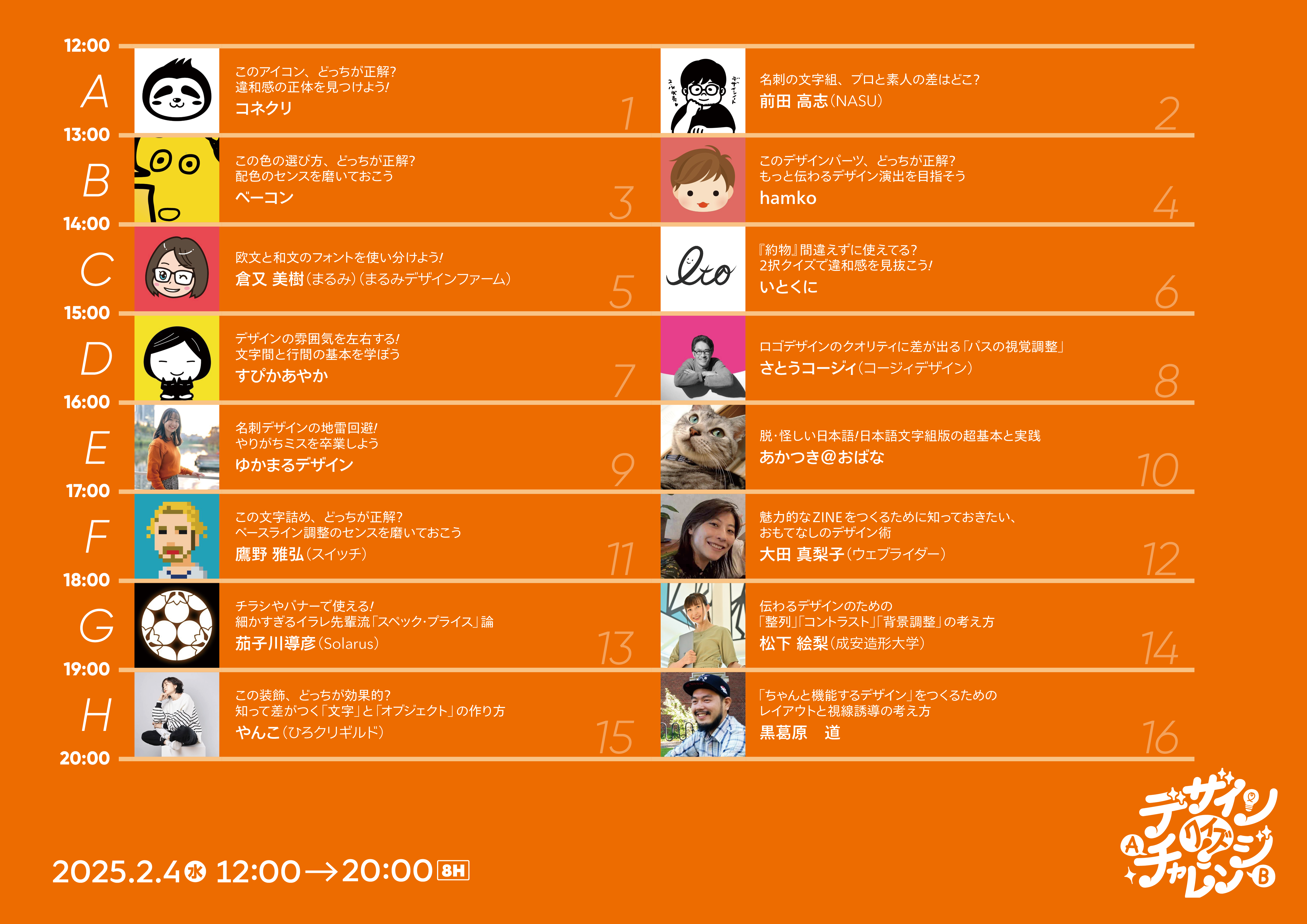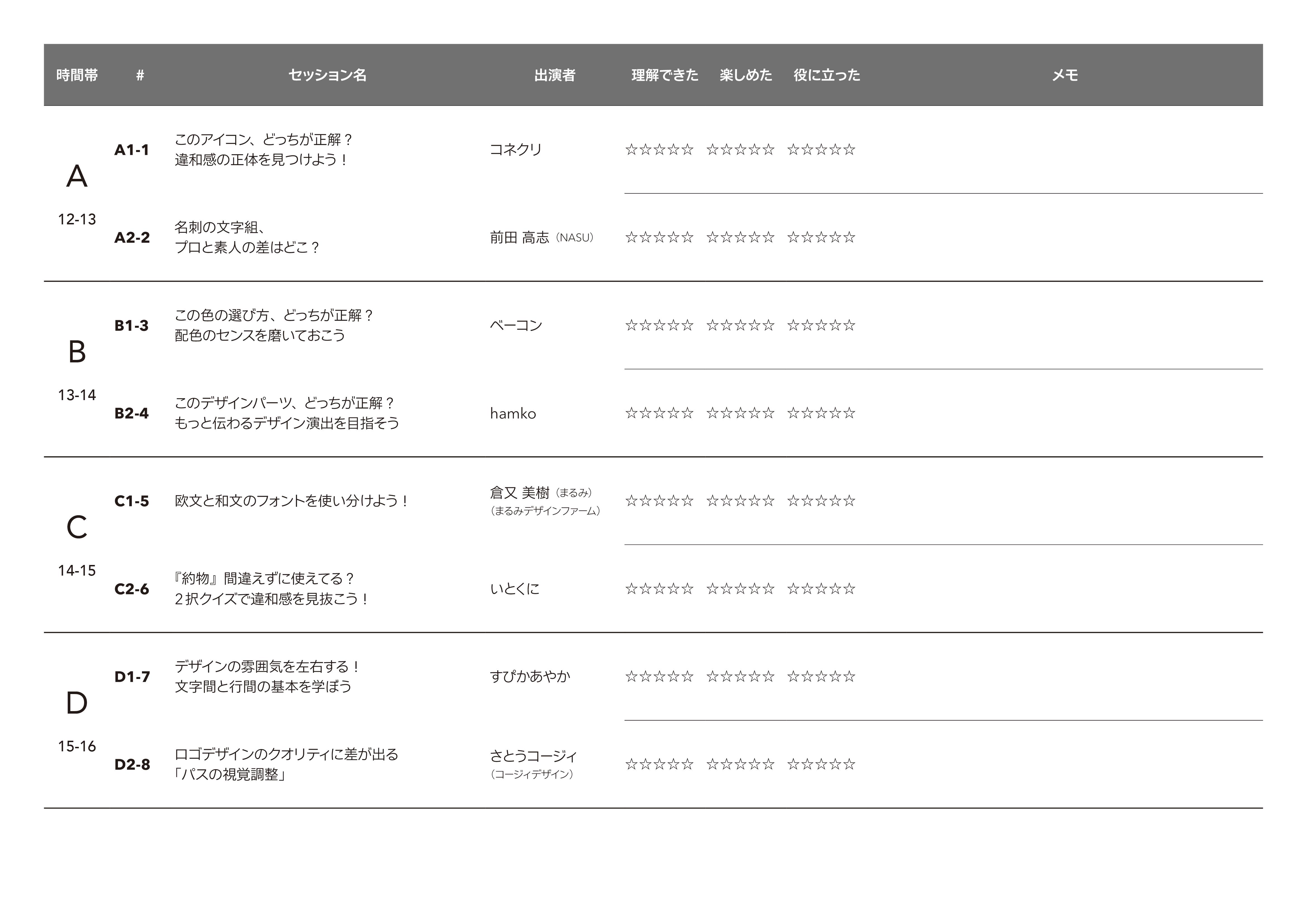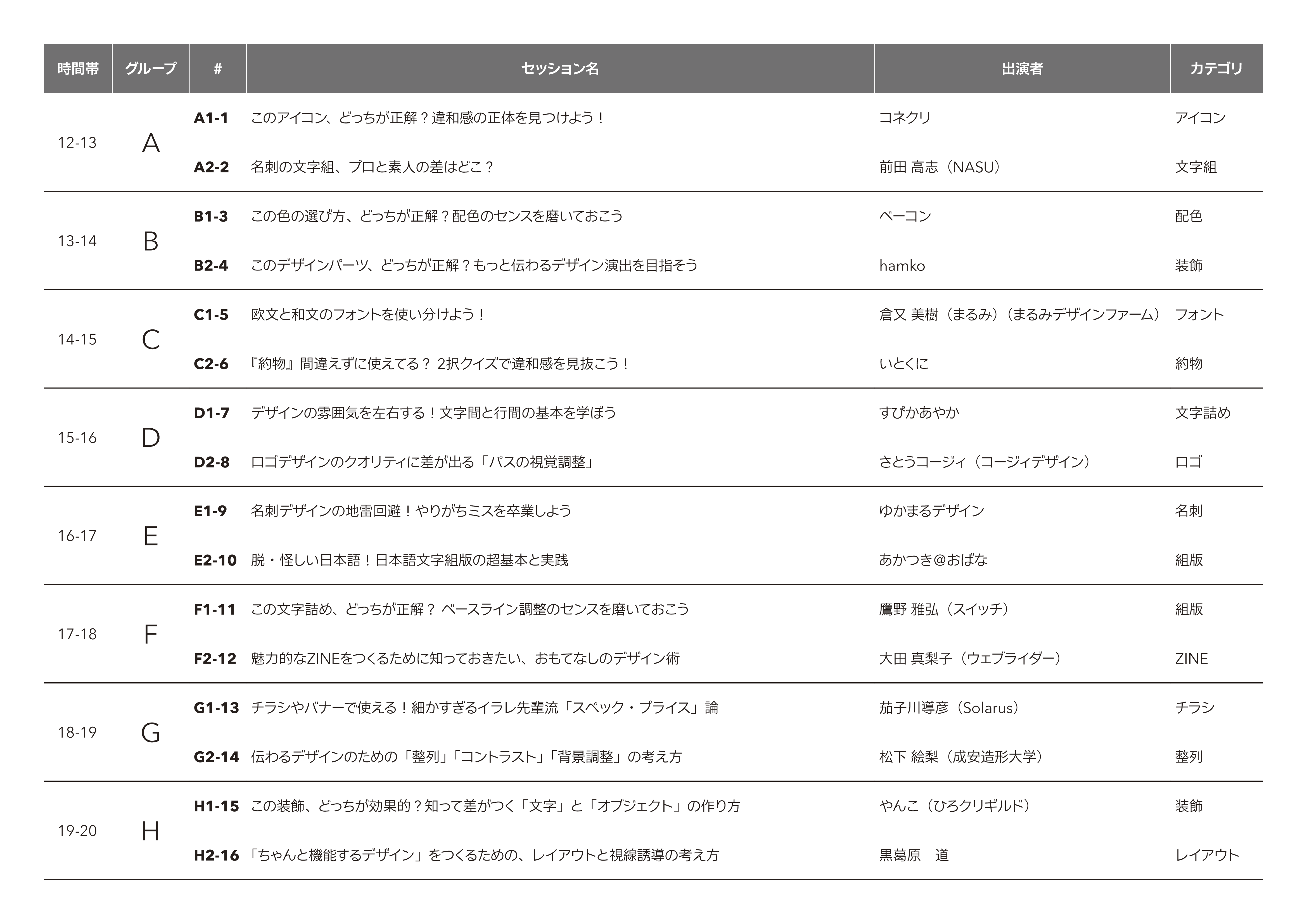 | 15-16 | D | D-1 | デザインの雰囲気を左右する!文字間と行間の基本を学ぼう | すぴかあやか |