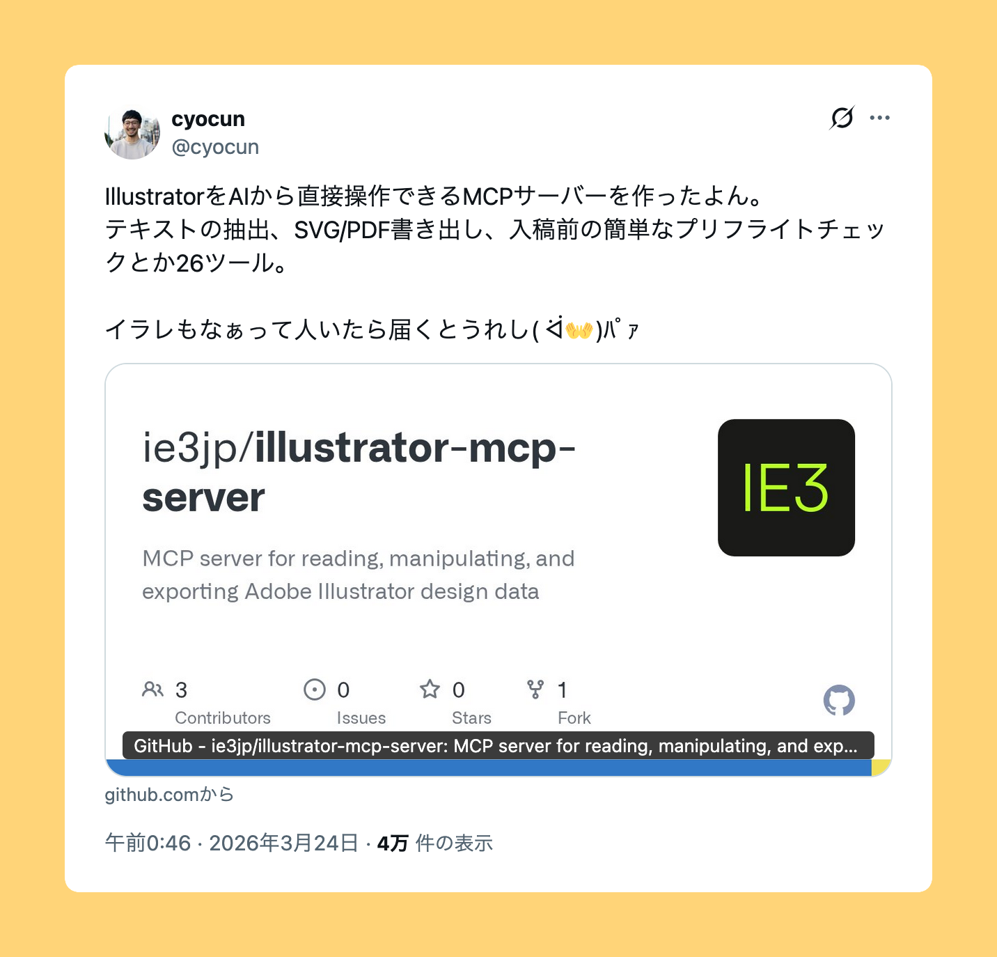 AIからIllustratorを直接操作できるMCPサーバーの実例を、cyocunさんにデモ形式でご紹介いただきます。